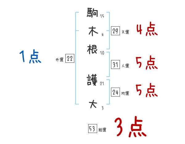 総運![]() | 駒木根護大さんの総運は53画の3つ星!やや見栄っ張りで虚栄心がある。散財に注意。 あなたの人生を表す1番重要な運勢です。生涯を通じて影響する総合運となり、主に50歳以降の晩年期に影響を及ぼします。 |