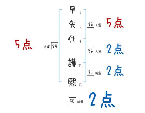 地運![]() | 早矢仕護煕さんの地運は34画の2つ星!独創性に優れるが、自尊心が強く災難に注意しましょう。 個性を表す基礎的な運勢です。性格形成や対人関係、行動力など家庭環境に影響されます。主に誕生してから20歳くらいまでの若年期の運勢を表します。 |