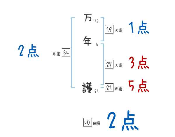 外運![]() | 万年護さんの外運は34画の2つ星!独創性に優れるが、自尊心が強く災難に注意しましょう。 生活面を象徴する運勢です。外部から受ける影響力を表し、結婚運、家庭運や職場、環境への順応性を表します。 |