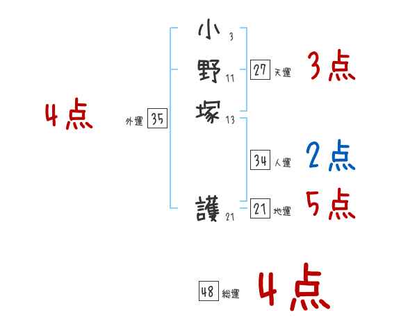 外運![]() | 小野塚護さんの外運は35画の4つ星!温厚な性格で感受性が高い。穏和な性格で人望が厚い。 生活面を象徴する運勢です。外部から受ける影響力を表し、結婚運、家庭運や職場、環境への順応性を表します。 |