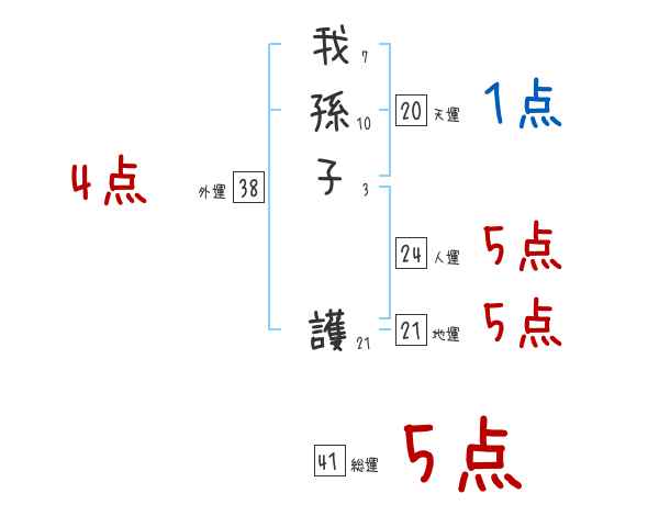 人運![]() | 我孫子護さんの人運は24画の5つ星!家庭運が良く順調な人生。金運にも恵まれる。 性格や才能などを表す2番目に重要な運勢です。人間関係や協調性、社会的な成功に影響します。主に20歳から50歳ぐらいまでの中年期の運勢を表します。 |