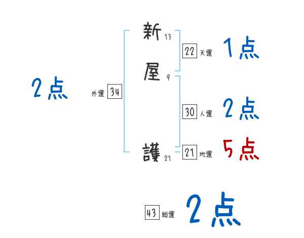 天運![]() | 新屋護さんの天運は22画の1つ星!努力することが苦手ないっぽう手先が器用。芸術性にも優れる。 家系が持つ宿命的な運勢を表します。祖先から受け継いだ苗字ですので自分の力が及びません。家柄を象徴します。 |