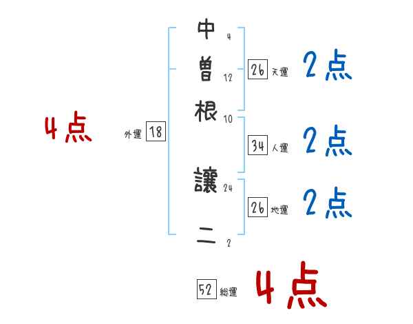 総運![]() | 中曽根讓二さんの総運は52画の4つ星!先見性と独創性に優れ考える力がある。強運の持ち主。 あなたの人生を表す1番重要な運勢です。生涯を通じて影響する総合運となり、主に50歳以降の晩年期に影響を及ぼします。 |