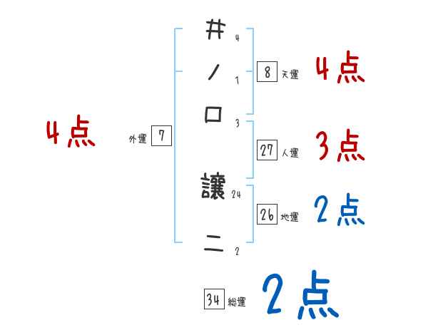 総運![]() | 井ノ口讓二さんの総運は34画の2つ星!独創性に優れるが、自尊心が強く災難に注意しましょう。 あなたの人生を表す1番重要な運勢です。生涯を通じて影響する総合運となり、主に50歳以降の晩年期に影響を及ぼします。 |