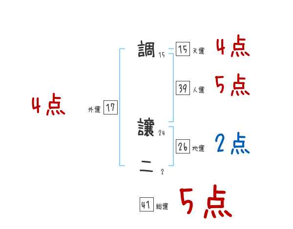 天運![]() | 調讓二さんの天運は15画の4つ星!人徳があり出世する。順調に物事を進め円満な人生。 家系が持つ宿命的な運勢を表します。祖先から受け継いだ苗字ですので自分の力が及びません。家柄を象徴します。 |