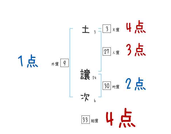 天運![]() | 土讓次さんの天運は3画の4つ星!活動的で才能に恵まれ、多くの信頼を得る。希望に満ち成長する。 家系が持つ宿命的な運勢を表します。祖先から受け継いだ苗字ですので自分の力が及びません。家柄を象徴します。 |