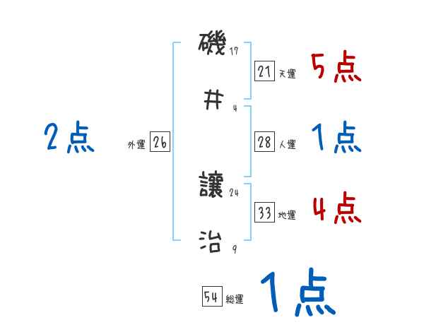 天運![]() | 磯井讓治さんの天運は21画の5つ星!統率力がある。独立し成功する。名誉を手に入れる。 家系が持つ宿命的な運勢を表します。祖先から受け継いだ苗字ですので自分の力が及びません。家柄を象徴します。 |