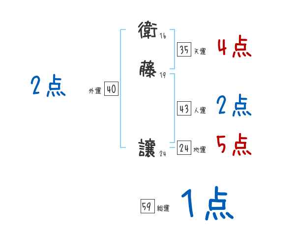 天運![]() | 衛藤讓さんの天運は35画の4つ星!温厚な性格で感受性が高い。穏和な性格で人望が厚い。 家系が持つ宿命的な運勢を表します。祖先から受け継いだ苗字ですので自分の力が及びません。家柄を象徴します。 |