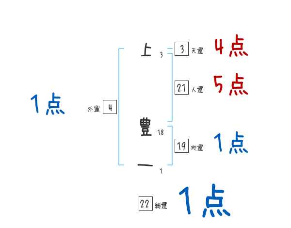 天運![]() | 上豊一さんの天運は3画の4つ星!活動的で才能に恵まれ、多くの信頼を得る。希望に満ち成長する。 家系が持つ宿命的な運勢を表します。祖先から受け継いだ苗字ですので自分の力が及びません。家柄を象徴します。 |