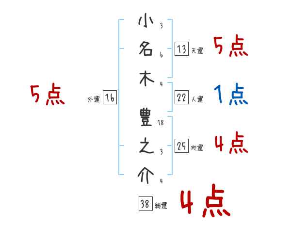 外運![]() | 小名木豊之介さんの外運は16画の5つ星!人望が厚く大きく発展する。逆転成功が見える。 生活面を象徴する運勢です。外部から受ける影響力を表し、結婚運、家庭運や職場、環境への順応性を表します。 |