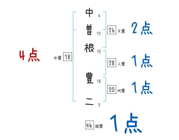 天運![]() | 中曽根豊二さんの天運は26画の2つ星!波瀾万丈かも。信頼できる人を大事にしましょう。 家系が持つ宿命的な運勢を表します。祖先から受け継いだ苗字ですので自分の力が及びません。家柄を象徴します。 |