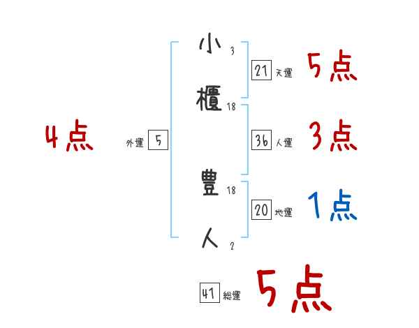 天運![]() | 小櫃豊人さんの天運は21画の5つ星!統率力がある。独立し成功する。名誉を手に入れる。 家系が持つ宿命的な運勢を表します。祖先から受け継いだ苗字ですので自分の力が及びません。家柄を象徴します。 |