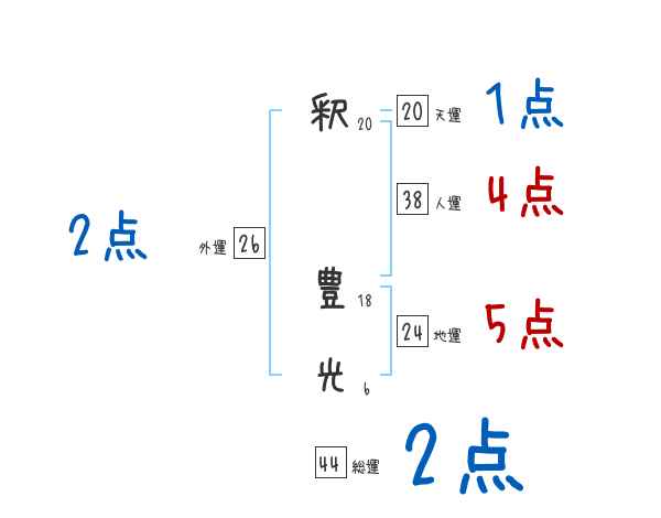 総運![]() | 釈豊光さんの総運は44画の2つ星!誠実で慎重な性格。物事を考えすぎないように注意しましょう。 あなたの人生を表す1番重要な運勢です。生涯を通じて影響する総合運となり、主に50歳以降の晩年期に影響を及ぼします。 |