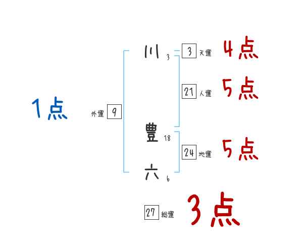 天運![]() | 川豊六さんの天運は3画の4つ星!活動的で才能に恵まれ、多くの信頼を得る。希望に満ち成長する。 家系が持つ宿命的な運勢を表します。祖先から受け継いだ苗字ですので自分の力が及びません。家柄を象徴します。 |