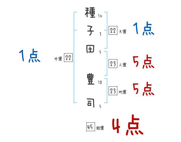 外運![]() | 種子田豊司さんの外運は22画の1つ星!努力することが苦手ないっぽう手先が器用。芸術性にも優れる。 生活面を象徴する運勢です。外部から受ける影響力を表し、結婚運、家庭運や職場、環境への順応性を表します。 |