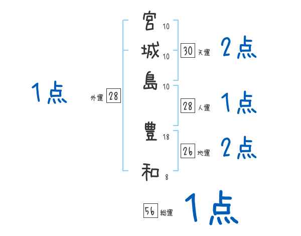天運![]() | 宮城島豊和さんの天運は30画の2つ星!浮き沈みの激しさに注意しましょう。 家系が持つ宿命的な運勢を表します。祖先から受け継いだ苗字ですので自分の力が及びません。家柄を象徴します。 |