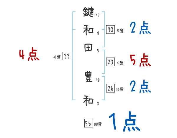 外運![]() | 鍵和田豊和さんの外運は33画の4つ星!権力志向でプライドが高い。勇気があり運を切り開き成功する。 生活面を象徴する運勢です。外部から受ける影響力を表し、結婚運、家庭運や職場、環境への順応性を表します。 |
