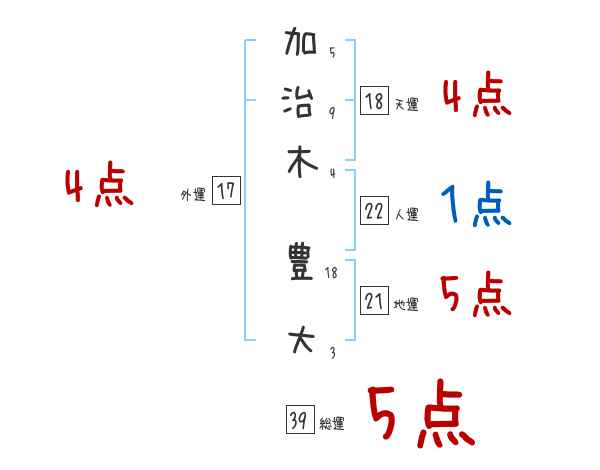 総運![]() | 加治木豊大さんの総運は39画の5つ星!社交性に優れ人望が厚い。人の上に立ち成功する。 あなたの人生を表す1番重要な運勢です。生涯を通じて影響する総合運となり、主に50歳以降の晩年期に影響を及ぼします。 |
