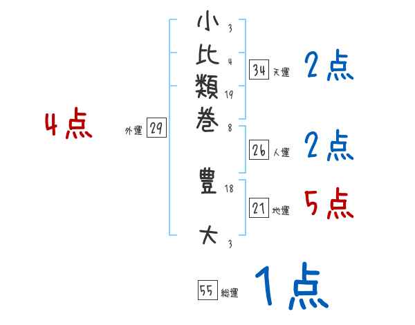 外運![]() | 小比類巻豊大さんの外運は29画の4つ星!完全主義で才能がある。厳格な心の持ち主。 生活面を象徴する運勢です。外部から受ける影響力を表し、結婚運、家庭運や職場、環境への順応性を表します。 |