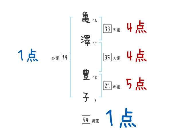 外運![]() | 亀澤豊子さんの外運は19画の1つ星!優れた才能を持ちますが、協調性が足りないことも。周りの人と協力する事を意識しましょう。 生活面を象徴する運勢です。外部から受ける影響力を表し、結婚運、家庭運や職場、環境への順応性を表します。 |