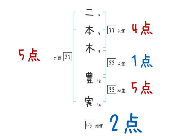 外運![]() | 二本木豊実さんの外運は21画の5つ星!統率力がある。独立し成功する。名誉を手に入れる。 生活面を象徴する運勢です。外部から受ける影響力を表し、結婚運、家庭運や職場、環境への順応性を表します。 |