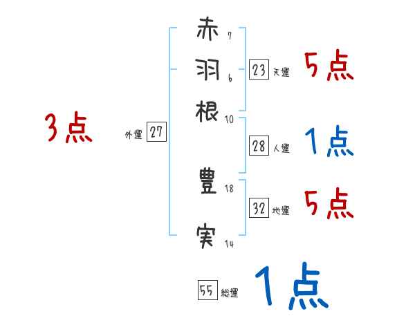 天運![]() | 赤羽根豊実さんの天運は23画の5つ星!想像力に優れ活力がある。一代で成功し名誉を手に入れる。 家系が持つ宿命的な運勢を表します。祖先から受け継いだ苗字ですので自分の力が及びません。家柄を象徴します。 |