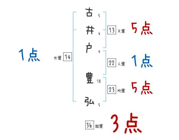 天運![]() | 古井戸豊弘さんの天運は13画の5つ星!才能に恵まれ人気がある。名声を手に入れる。円満な人生。 家系が持つ宿命的な運勢を表します。祖先から受け継いだ苗字ですので自分の力が及びません。家柄を象徴します。 |