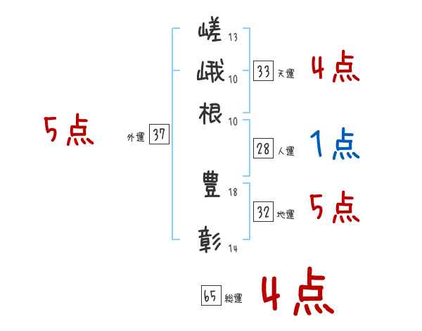 地運![]() | 嵯峨根豊彰さんの地運は32画の5つ星!柔軟性があり成功する。チャンスが多く金運が良い。 個性を表す基礎的な運勢です。性格形成や対人関係、行動力など家庭環境に影響されます。主に誕生してから20歳くらいまでの若年期の運勢を表します。 |