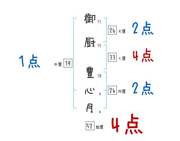 天運![]() | 御厨豊心月さんの天運は26画の2つ星!波瀾万丈かも。信頼できる人を大事にしましょう。 家系が持つ宿命的な運勢を表します。祖先から受け継いだ苗字ですので自分の力が及びません。家柄を象徴します。 |