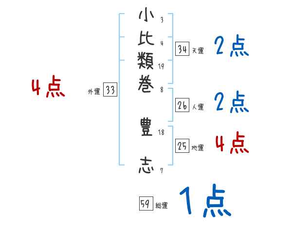 外運![]() | 小比類巻豊志さんの外運は33画の4つ星!権力志向でプライドが高い。勇気があり運を切り開き成功する。 生活面を象徴する運勢です。外部から受ける影響力を表し、結婚運、家庭運や職場、環境への順応性を表します。 |