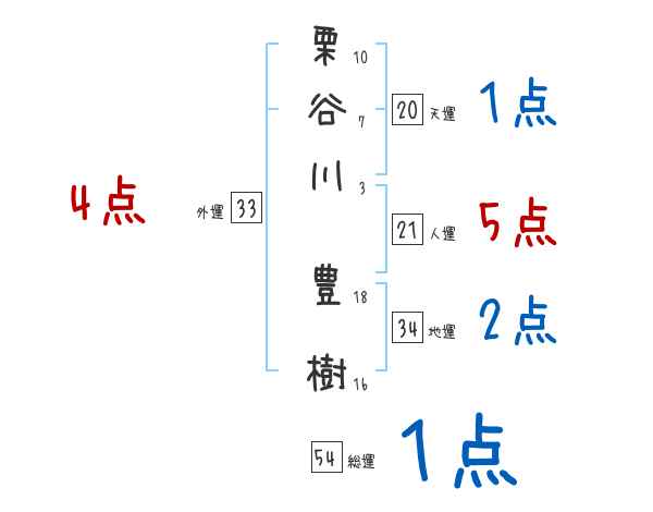 外運![]() | 栗谷川豊樹さんの外運は33画の4つ星!権力志向でプライドが高い。勇気があり運を切り開き成功する。 生活面を象徴する運勢です。外部から受ける影響力を表し、結婚運、家庭運や職場、環境への順応性を表します。 |