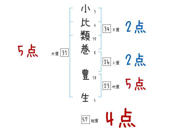 天運![]() | 小比類巻豊生さんの天運は34画の2つ星!独創性に優れるが、自尊心が強く災難に注意しましょう。 家系が持つ宿命的な運勢を表します。祖先から受け継いだ苗字ですので自分の力が及びません。家柄を象徴します。 |