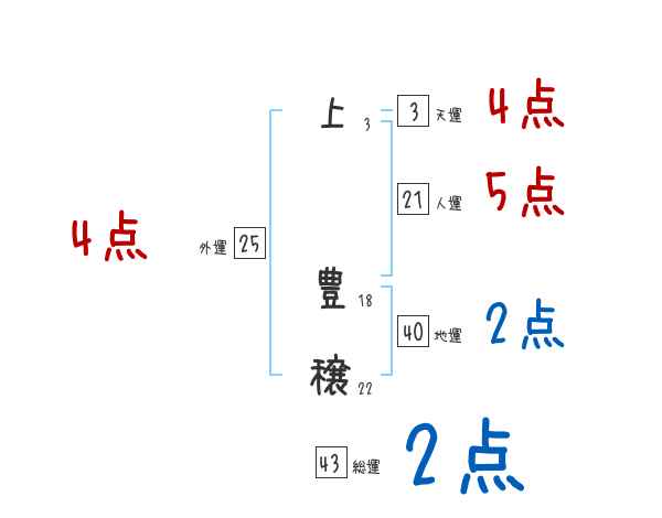 天運![]() | 上豊穣さんの天運は3画の4つ星!活動的で才能に恵まれ、多くの信頼を得る。希望に満ち成長する。 家系が持つ宿命的な運勢を表します。祖先から受け継いだ苗字ですので自分の力が及びません。家柄を象徴します。 |