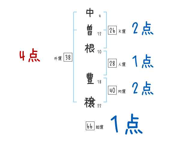 人運![]() | 中曽根豊穣さんの人運は28画の1つ星!家庭環境に注意。スポーツで活躍できる能力があるかも。 性格や才能などを表す2番目に重要な運勢です。人間関係や協調性、社会的な成功に影響します。主に20歳から50歳ぐらいまでの中年期の運勢を表します。 |