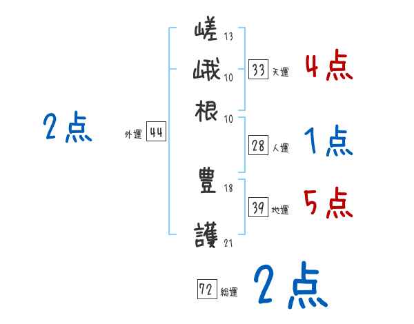 天運![]() | 嵯峨根豊護さんの天運は33画の4つ星!権力志向でプライドが高い。勇気があり運を切り開き成功する。 家系が持つ宿命的な運勢を表します。祖先から受け継いだ苗字ですので自分の力が及びません。家柄を象徴します。 |