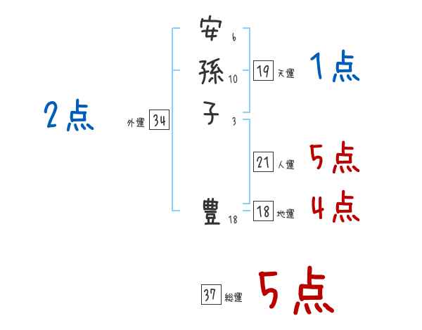 外運![]() | 安孫子豊さんの外運は34画の2つ星!独創性に優れるが、自尊心が強く災難に注意しましょう。 生活面を象徴する運勢です。外部から受ける影響力を表し、結婚運、家庭運や職場、環境への順応性を表します。 |