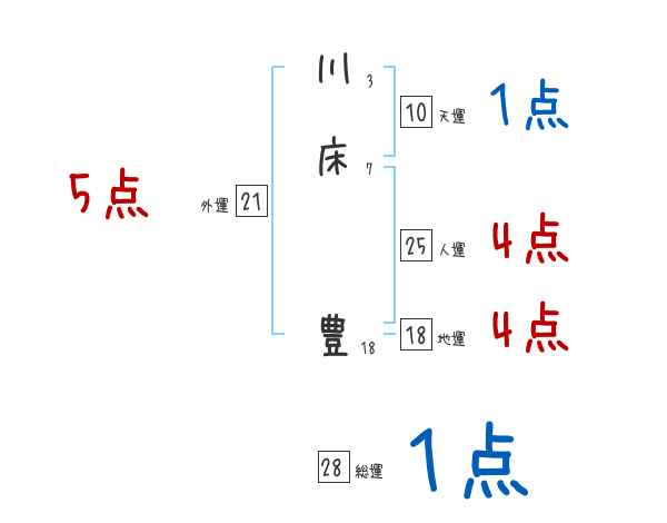 総運![]() | 川床豊さんの総運は28画の1つ星!家庭環境に注意。スポーツで活躍できる能力があるかも。 あなたの人生を表す1番重要な運勢です。生涯を通じて影響する総合運となり、主に50歳以降の晩年期に影響を及ぼします。 |