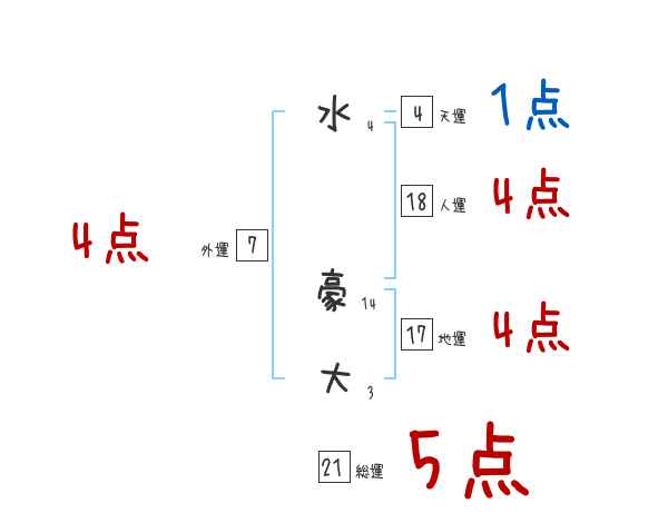 天運![]() | 水豪大さんの天運は4画の1つ星!感情が不安定で苦労するかも。周囲との協調を心掛けましょう。 家系が持つ宿命的な運勢を表します。祖先から受け継いだ苗字ですので自分の力が及びません。家柄を象徴します。 |