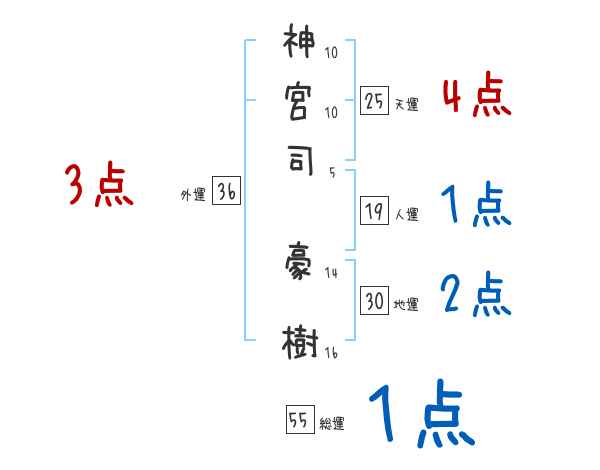 外運![]() | 神宮司豪樹さんの外運は36画の3つ星!先見性が豊かです。多少神経質で苦労することも。 生活面を象徴する運勢です。外部から受ける影響力を表し、結婚運、家庭運や職場、環境への順応性を表します。 |