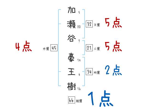 天運![]() | 加瀬谷豪王樹さんの天運は32画の5つ星!柔軟性があり成功する。チャンスが多く金運が良い。 家系が持つ宿命的な運勢を表します。祖先から受け継いだ苗字ですので自分の力が及びません。家柄を象徴します。 |