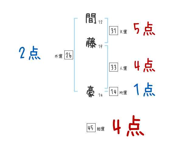 天運![]() | 間藤豪さんの天運は31画の5つ星!社交性があり判断力に優れる。順風満帆な人生で円満な生活。 家系が持つ宿命的な運勢を表します。祖先から受け継いだ苗字ですので自分の力が及びません。家柄を象徴します。 |