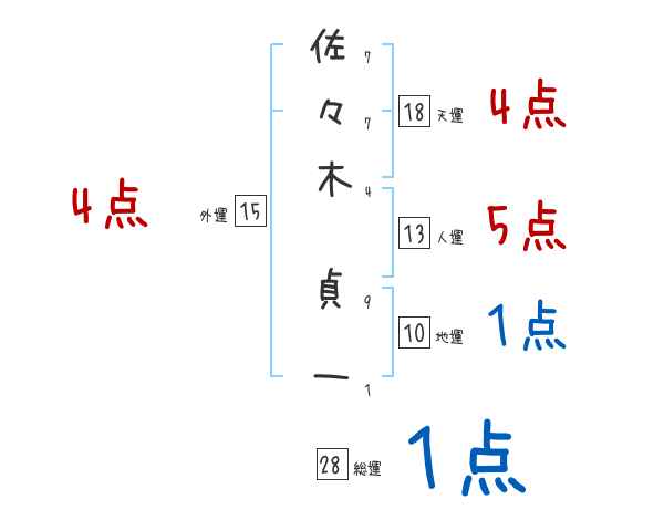 総運![]() | 佐々木貞一さんの総運は28画の1つ星!家庭環境に注意。スポーツで活躍できる能力があるかも。 あなたの人生を表す1番重要な運勢です。生涯を通じて影響する総合運となり、主に50歳以降の晩年期に影響を及ぼします。 |