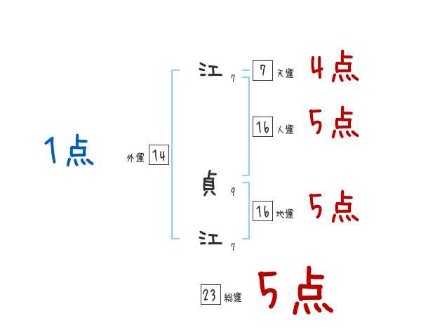人運![]() | 江貞江さんの人運は16画の5つ星!人望が厚く大きく発展する。逆転成功が見える。 性格や才能などを表す2番目に重要な運勢です。人間関係や協調性、社会的な成功に影響します。主に20歳から50歳ぐらいまでの中年期の運勢を表します。 |