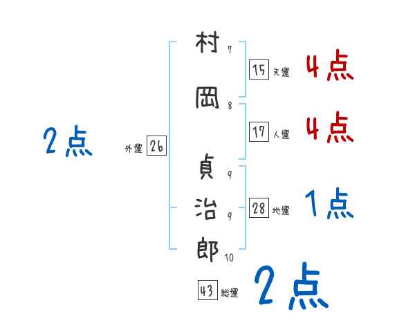外運![]() | 村岡貞治郎さんの外運は26画の2つ星!波瀾万丈かも。信頼できる人を大事にしましょう。 生活面を象徴する運勢です。外部から受ける影響力を表し、結婚運、家庭運や職場、環境への順応性を表します。 |