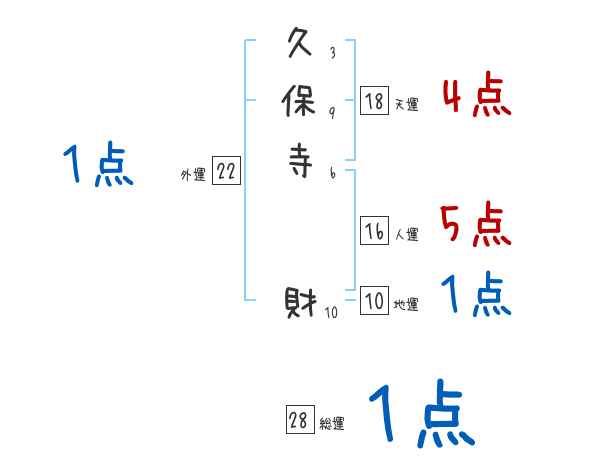 総運![]() | 久保寺財さんの総運は28画の1つ星!家庭環境に注意。スポーツで活躍できる能力があるかも。 あなたの人生を表す1番重要な運勢です。生涯を通じて影響する総合運となり、主に50歳以降の晩年期に影響を及ぼします。 |