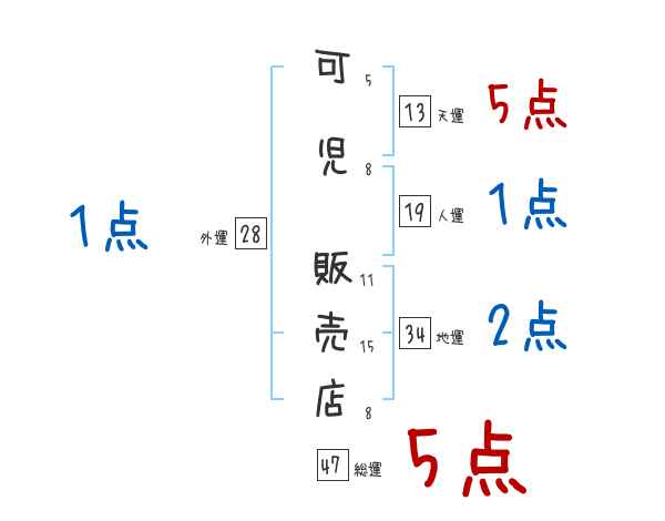 総運![]() | 可児販売店さんの総運は47画の5つ星!実力が開花し発展する円満な人生。財に恵まれる。 あなたの人生を表す1番重要な運勢です。生涯を通じて影響する総合運となり、主に50歳以降の晩年期に影響を及ぼします。 |