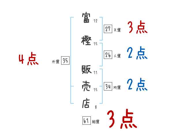 天運![]() | 富樫販売店さんの天運は27画の3つ星!頭脳明晰だが強情で摩擦が多い傾向。孤立に注意。 家系が持つ宿命的な運勢を表します。祖先から受け継いだ苗字ですので自分の力が及びません。家柄を象徴します。 |