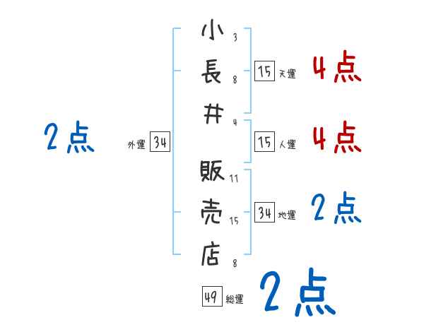 地運![]() | 小長井販売店さんの地運は34画の2つ星!独創性に優れるが、自尊心が強く災難に注意しましょう。 個性を表す基礎的な運勢です。性格形成や対人関係、行動力など家庭環境に影響されます。主に誕生してから20歳くらいまでの若年期の運勢を表します。 |