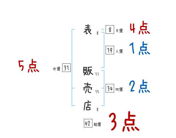 外運![]() | 表販売店さんの外運は31画の5つ星!社交性があり判断力に優れる。順風満帆な人生で円満な生活。 生活面を象徴する運勢です。外部から受ける影響力を表し、結婚運、家庭運や職場、環境への順応性を表します。 |