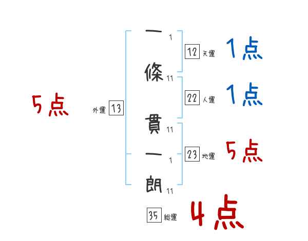 天運![]() | 一條貫一朗さんの天運は12画の1つ星!簡単な失敗で諦めてしまいやすいかも。着実に行動すると良いでしょう。 家系が持つ宿命的な運勢を表します。祖先から受け継いだ苗字ですので自分の力が及びません。家柄を象徴します。 |